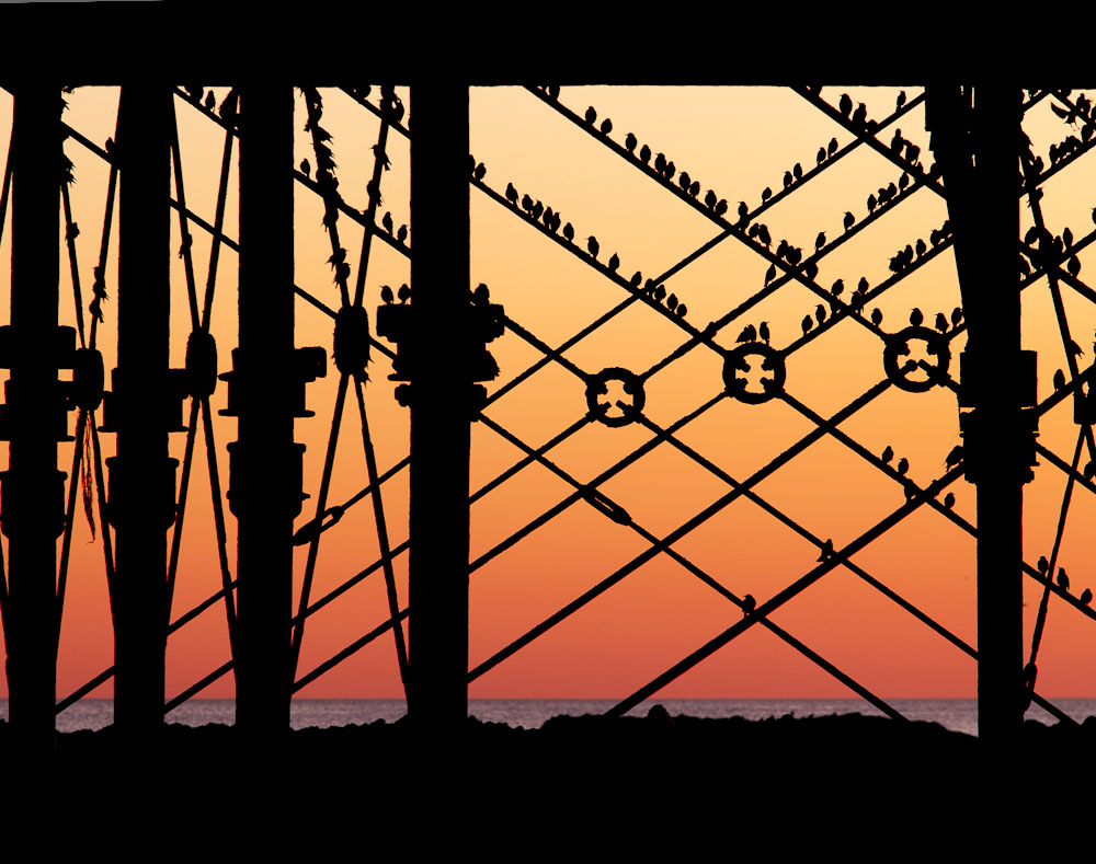 Every year from October to March starlings roost under the pier at Aberystwyth; under the right conditions the sky can be a swirling mass of them. On a sunny evening there can be quite a group of photographers there. Being a fairly solitary breed it is one of the few times we get together for a chat! Local people and visitors also gather to witness one of nature’s great spectacles. The starlings put on their most amazing displays just before they leave for their breeding quarters. The image was taken in March.