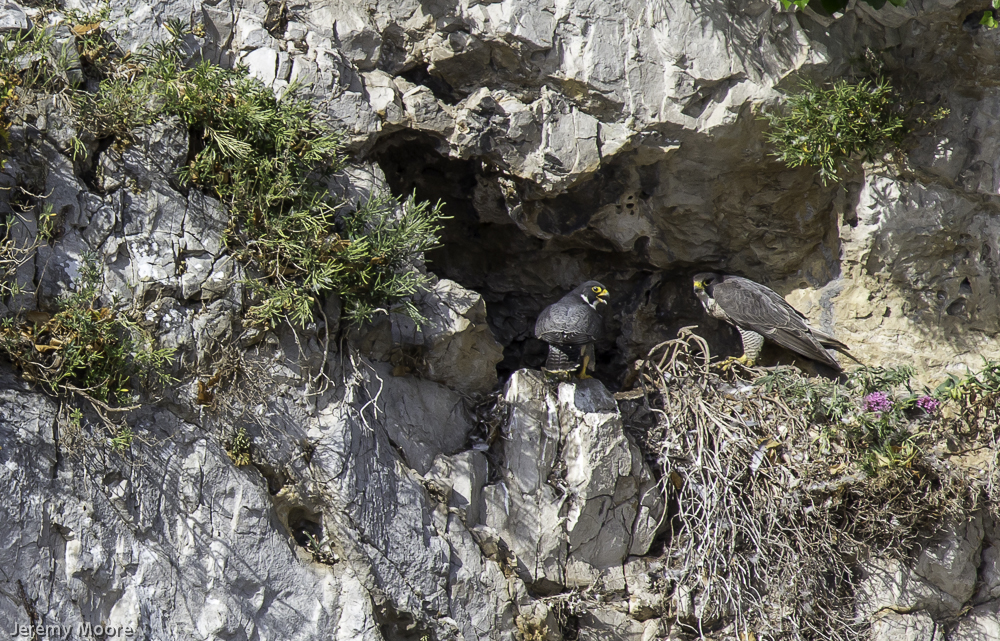 Earlier this week I whizzed down to south Wales in the hope of photographing peregrines at their nest site on a limestone cliff-face. It did not take me long to find another photographer with long lens and tripod and I knew I had come to the right place. He told me that the peregrine “chick” was about to leave the nest. It had been jumping around on the ledge and flapping its wings powerfully. Had I arrived just in time?
