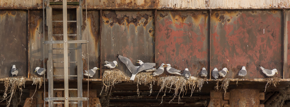 Conditions were ideal for the subject at hand. It was evening by this time and partly cloudy, so there was a choice of bright but cloudy or pale sunlight. There would be little or no disruptive shadow. Kittiwakes were lined up along the metal framework of the tower in some numbers. There were a few abandoned nests and rather more part-built ones which I suppose could have been practice nests built by inexperienced adults. I played around for quite some time, trying different viewpoints, focal lengths and crops, uncertain really how to best tackle the subject. Every so often a bird would land on the “ledge” and there would be a flurry of activity amongst nearby birds. It proved to be one of these images that to me was the most successful, taken at 600mm and cropped quite heavily again.