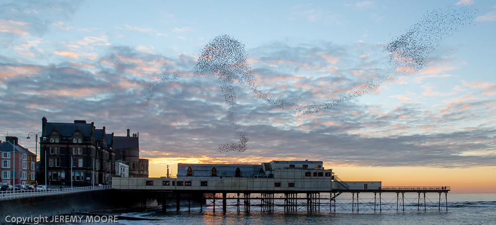 Back in Aberystwyth, decent sunsets have encouraged me to visit the starling roost three times this week. Tuesday was just the most gorgeous winter evening; cloud had largely cleared during the afternoon and there was no wind. The starlings must have felt it too. For a few brief moments a flock briefly indulged in one of their spectacular ribbon/bracelet formations before dropping in under the pier. At last! Something to write home about……