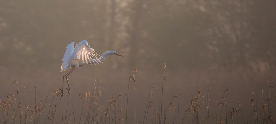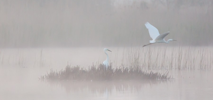 Meanwhile a pair of great white egrets were just becoming active in the mist nearby, offering a stunning spectacle to the photographer. But he just didn’t seem to notice. Fortunately a couple of other photographers arrived which took the pressure off me to respond! The sun began to break through the trees, spotlighting sections of the egrets’ brilliant white plumage. I couldn’t believe I was the only one pointing my camera in their direction.