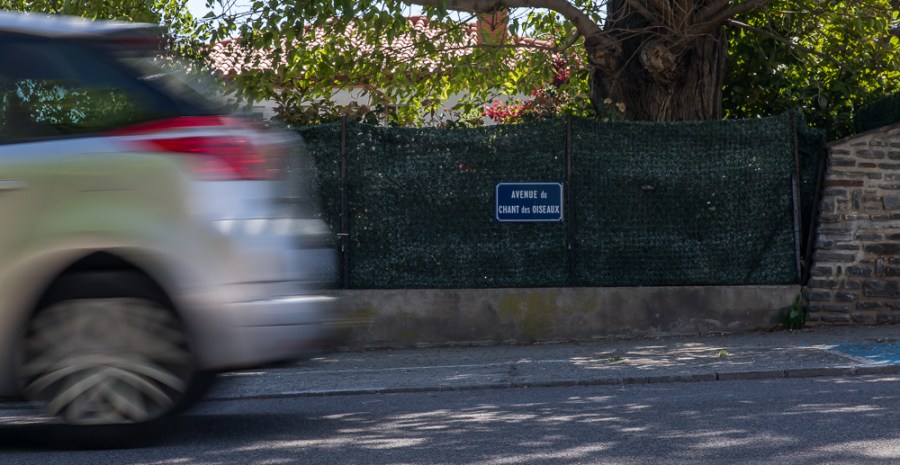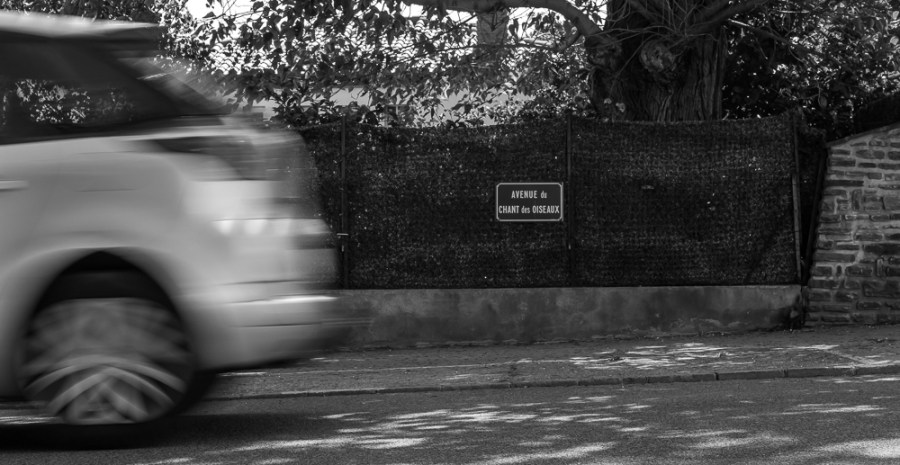 After a week in Spain we moved on to the Tet valley about 25 miles inland of Perpignan in France. The local town was Prades, where we went for shopping, the farmers market and meals out.. On one visit while parking the car I happened to notice the street name – Avenue du Chants des Oiseaux : or Birdsong Avenue in English . How beautiful and how gently surreal! I took a snap with my phone and mulled it over for a day or two before returning with my full kit. I took a series of exposures as cars went past, using long-ish shutter speeds to give a sense of movement, and a narrow aperture for depth of field – in this case the combination was 1/40th second at f14.