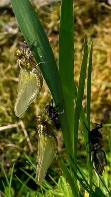 Postscript: the emergence is still in progress. I have just counted eight fresh insects around the pond but several do not appear to have expanded their wings fully. It doesn’t look like they will survive. Maybe they need the warmth of full sunlight to emerge successfully?