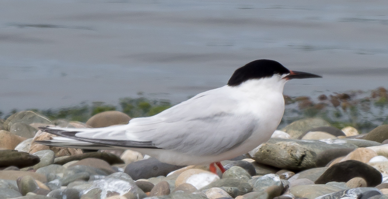 During the afternoon, as the tide receded, more and more terns rested on the beach, sometimes no more than ten yards away. It gave me the chance to examine them in detail. I picked out one individual with a black bill, one of the most noticeable features of a roseate tern. The more I looked, the more black bills I found, perhaps half a dozen of them altogether. Were they ALL roseates? Another birder examined them with a telescope and confidently told me that they were; I wasn’t convinced. Another said they were, in fact, first-summer arctics – despite the fact that they normally spend their entire first year in the Antarctic and are scarce in the UK. The secret is in the colour of their legs – roseates have (relatively) long bright red legs while those of the arctics are very dark red or black and very short.