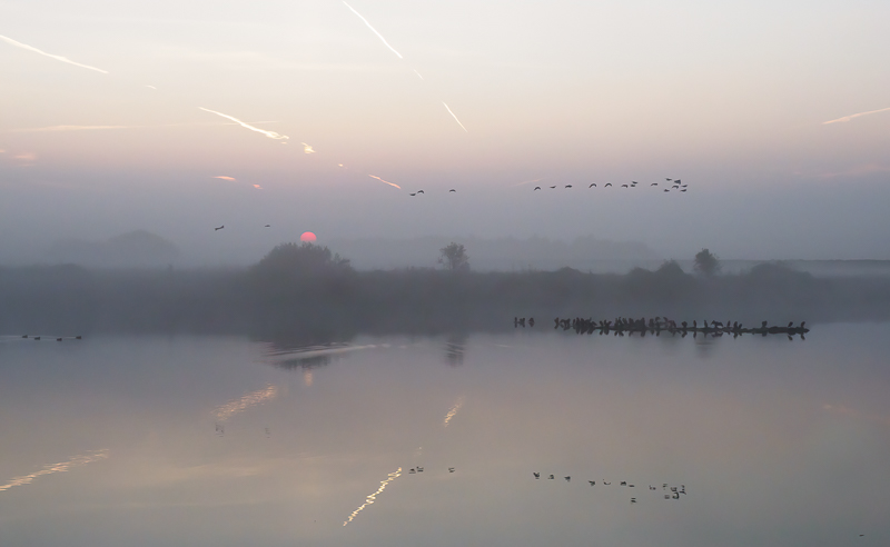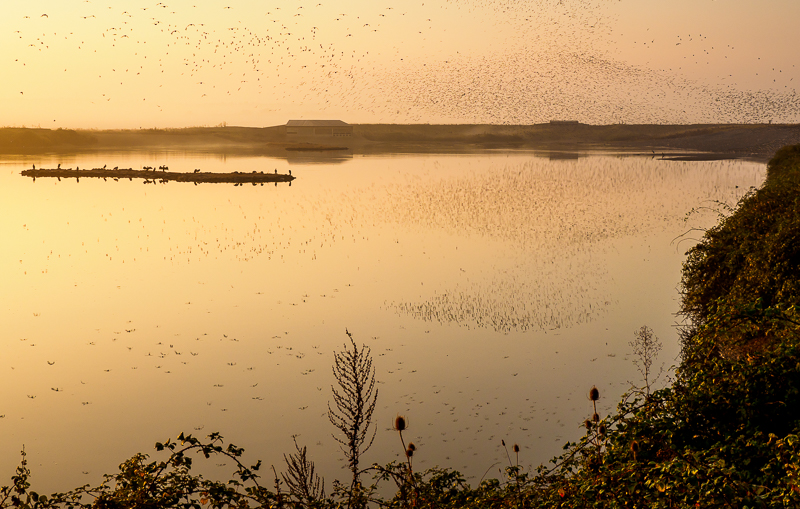 The following morning dawned clear. It was still dark when I set off but stars were visible overhead and there was no wind. This was promising. As the day began to dawn I began to see what a lovely morning it was – slightly misty and with low-lying fog in places. Birders and photographers were already gathering by the time I arrived at the wader watchpoint on the banks of the Wash. A golden glow was just beginning to appear to the east. I noticed another hide which faced eastwards across the lagoon.