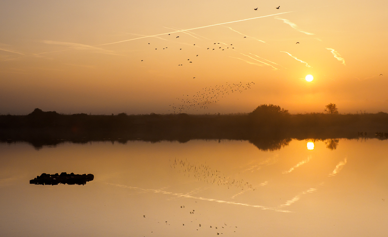 The sun had not yet risen. I don’t want to sound too heroic about that – sunrise is quite late in October. But there was potential for exciting images if flocks of waders flew around above the still waters of the lagoon before settling at the southern end as they tend to do. I wouldn’t be able to see westwards as the birds gathered offshore but I had nothing to lose, really. The hide was almost empty but some strategically situated vapour trails made some wonderful geometric shapes in the sky. I sat and waited for some action.