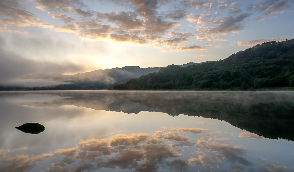 I made a decision to “go for it” even though I knew my trip would only be a short one. I headed up to north Wales for some landscape photography. On these trips I nearly always end up at Llyn Dinas (near Beddgelert) but this time I made the decision to search out some new locations. And where did I end up? You’ve guessed it….. Llyn Dinas. And while I was there I realised why: it is one of the very best locations in Wales for the landscaper – and for several reasons. The lake and its surroundings are perhaps as close to “the sublime” as it is possible to find in Wales. More practically, it is very close to the road – always handy for dawn visits; there are fairly secluded parking areas (for the camper van) nearby- ditto; and surrounded by mountains, its waters have a tendency to be still early on sunny mornings; and finally, it is also prone to valley fog. Last Thursday was one such morning.
