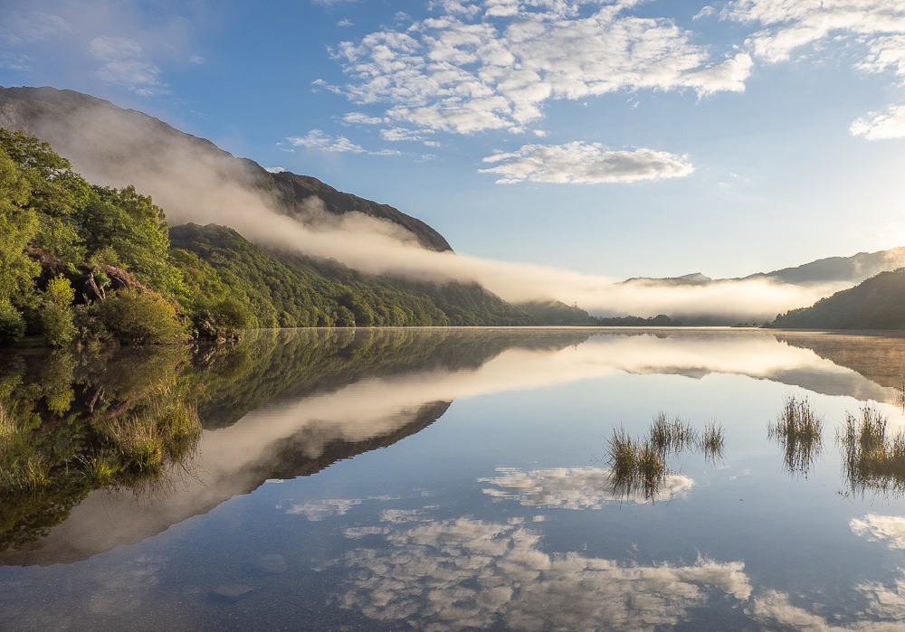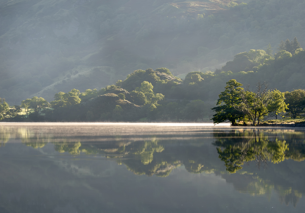 The top photo was taken as soon as I arrived and shows the lake just post-sunrise. The second shows Llyn Dinas at its idyllic best, about three-quarters of an hour later. The sense of calm that the image suggests is slightly misleading, however, as some voracious midges were making life very difficult for the photographer and it felt far from idyllic! I feel that the warmth from the sunlight on the trees adds an extra dimension that is missing in the earlier photo. After a session here I motored the short distance up to Llyn Gwynant by which time the fog was thinning and lifting quickly. I think some lake-side trees have been removed here, opening up a new vista across the water. I took another series of images with a very different feel, including the third one above.