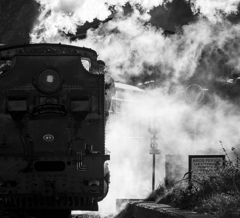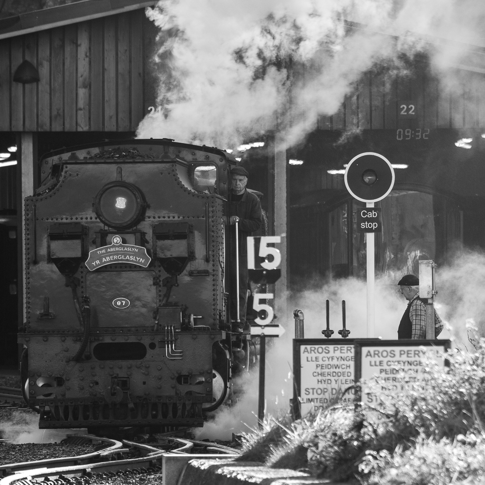 From here one is very close to the Boston Lodge HQ of the Ffestiniog and Welsh Highland Railways. Steam engines are prepared here every morning for service on the lines to Blaenau Ffestiniog and Caernarfon. By now the sun was strong and the activities around the engine sheds were either in deep shadow or strongly backlit. This made some powerful images possible as the trains were put together and then headed off to Porthmadog Harbour station ready to pick up passengers. I love the black-and-white look for steam railways: it reminds me of the last years of steam on British Rail in the 1960’s, when the railway magazines I read were still mostly in b&w.