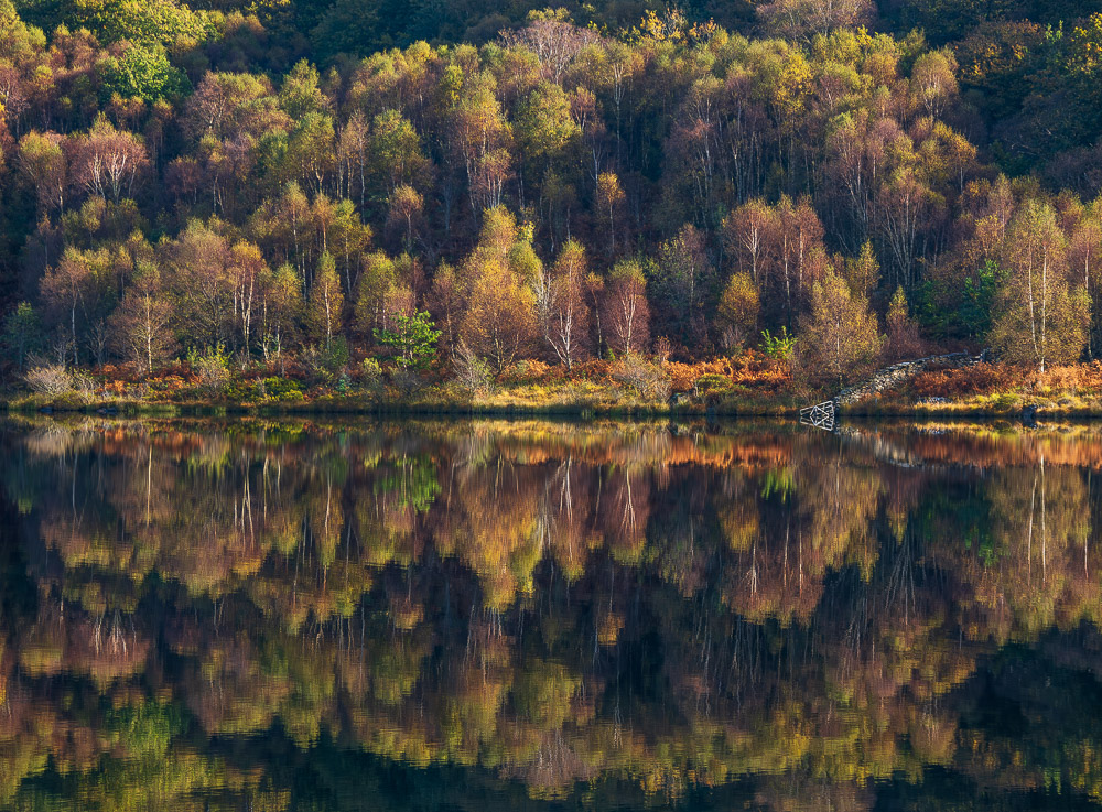 The lake was perfectly still with mirror-like reflections. Birch trees on the far side of the lake had lost some of their leaves, revealing purple twigs and silver trunks and branches. The remaining leaves were in a range of yellows and greens. Between the trees lay dark shadows. It was such a simple photograph to take, but it works so well. The tiny gate on the right-hand side (and its reflection) seem critical to the composition, and the whole thing has a hypnotic, mandala-like effect on me. I could disappear into it.