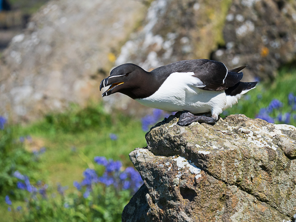 The path wound up through broken rock and grassy slopes dotted with bluebells and other spring flowers. Puffins seemed to be everywhere and were more approachable than they are on the Pembrokeshire islands. Some were quite oblivious to any human presence. Two visitors ahead of me seemed to be photographing a low rock-face but there was actually a pair of puffins pottering in and out of their nest in a crevice just behind it. I could easily have reached out and touched them. They are absolutely enchanting birds and I make no apologies for presenting a photograph of them in all their cuteness. Perhaps we love them so much because they remind us of ourselves? (See the main pic)