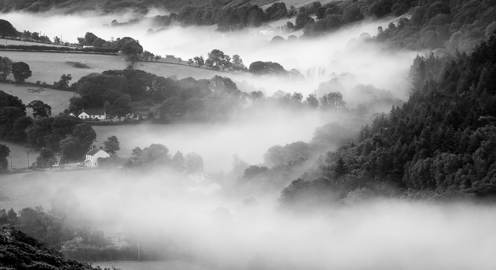 Well, I can only think of one. Sometimes a visit to the loo before sunrise on a summer’s morning can present the photographer with scenes like this. The photograph was taken less than five minutes from my front door. Valley fog was slowly “flowing” down to the coast from the uplands; thanks to my inability to sleep I was able to get outside and take a few photographs. The sun had not yet risen above the Cambrian Mountains to the east so the light was soft and gentle.