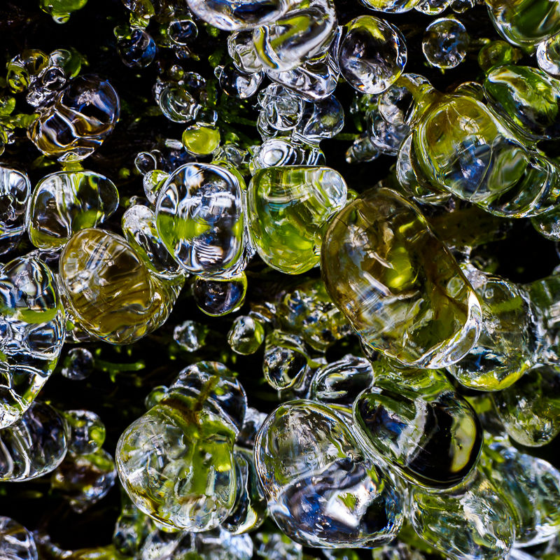 This is one of the very few photographs I took last winter. If I drop down into the valley below my hilltop home and, dodging irate farmers, walk upstream for about half a mile, I reach a waterfall which virtually no-one knows about. If it wasn’t for the trees that have toppled into the mini ravine below it, it would be the perfect waterfall, and I would photograph it in all weathers. Last February after a couple of frosty days and nights I thought I would go and investigate. Water droplets thrown up by the falls had collected on the mossy sides of the ravine and frozen. Risking life and limb (well, maybe), I took a series of extreme close-ups, and this was the best of the bunch.