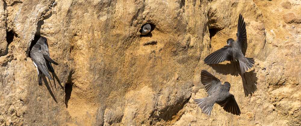 I had no idea what to expect visually other than the “Road Closed” sign that features in all the media. Arriving late in the morning I clambered across a pile of earth blocking an old field gateway to reach the cliff top. Directly below me a flock of sand martins were excitedly excavating nesting burrows in the sandy escarpment facing the sea. They barely noticed me at all and only made themselves scarce when a kestrel cruised by. This photo-op felt like a real bonus; the only drawback being the strong and distracting shadows of the birds created by the sun beating down from a clear blue sky. The sand martins were frantically landing and taking off again; you could see tiny showers of sand falling from burrow entrances, and a close examination of the photographs shows a pattern of scrape marks made by their claws on the cliff-face.