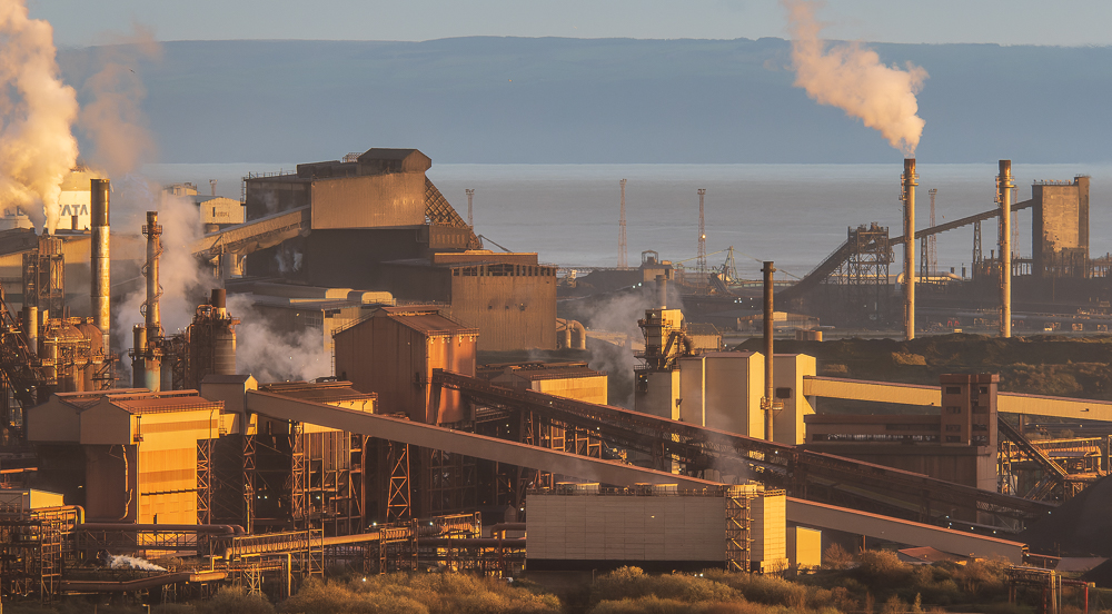 It was late afternoon by now and I could see a slot in the clouds close to the horizon in the western sky. It looked like I might get some golden hour light on the works if I was patient. I returned to my original viewpoint, and the sun crept slowly towards the slot. When it did finally emerge the steel complex was bathed in golden light. Right on cue a thick cloud of orange-brown smoke belched out from the centre of the complex and dissipated into the air above it. It was an exciting moment but………..